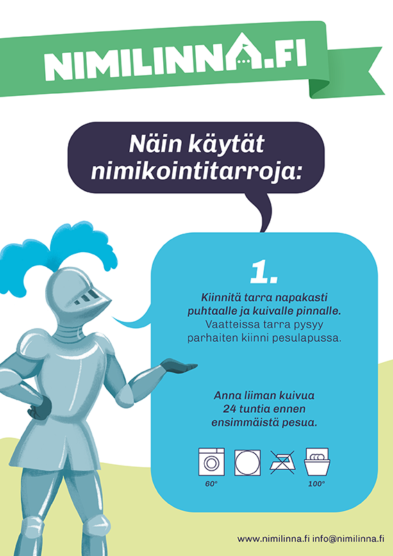 Tavaroissa ja asusteissa joissa ei ole pesulappua, tarra pysyy parhaiten kiinni tasaisella ja puhdistetulla pinnalla. Anna tarran kiinnittyä 24 tunnin ajan ennen pesua.