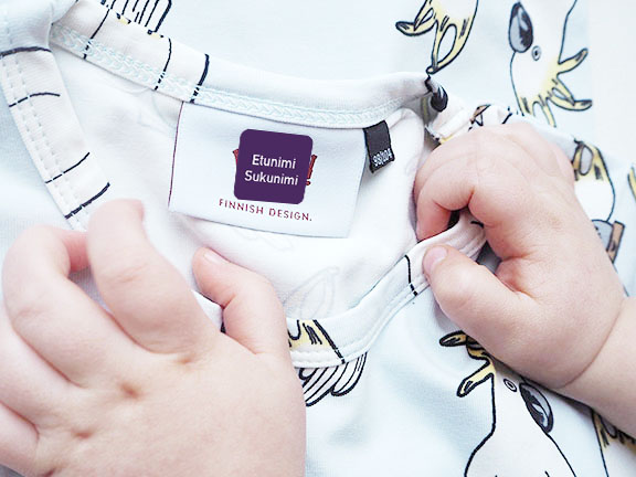 Irroita tarra arkistaan ja paina tarra liimapinta nimikoitavan vaatteen pesu– tai merkkilappuun kiinni, ei kuitenkaan suoraan vaatteen kankaaseen.
