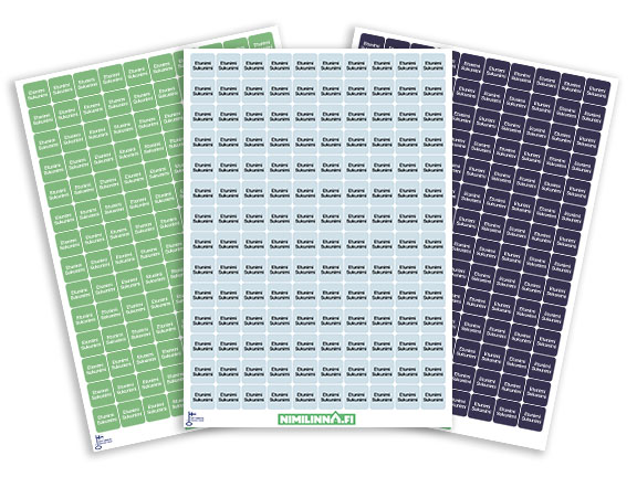 Ympyrän muotoinen tarra (Ø 18mm) sopii hyvin vaatteiden pesulappuihin. Neliön muotoinen suurin tarra (18x18mm) näkyy hyvin myös tavaroissa. Suorakulmion muotoiselle tarralle (22x12mm) mahtuu pidempikin nimi.